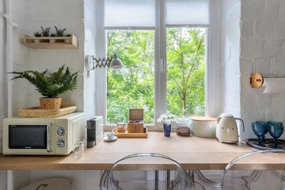 А так выглядит сама кухня. Шкафы — икеевские, паркет — новый, стены побелены. Обеденный стол вынесли в гостиную, поэтому здесь стало чуть просторнее. Вместо него поставили столешницу, совмещенную с подоконником. Здесь можно перекусить по-быстрому, когда нет времени или настроения накрыть стол.