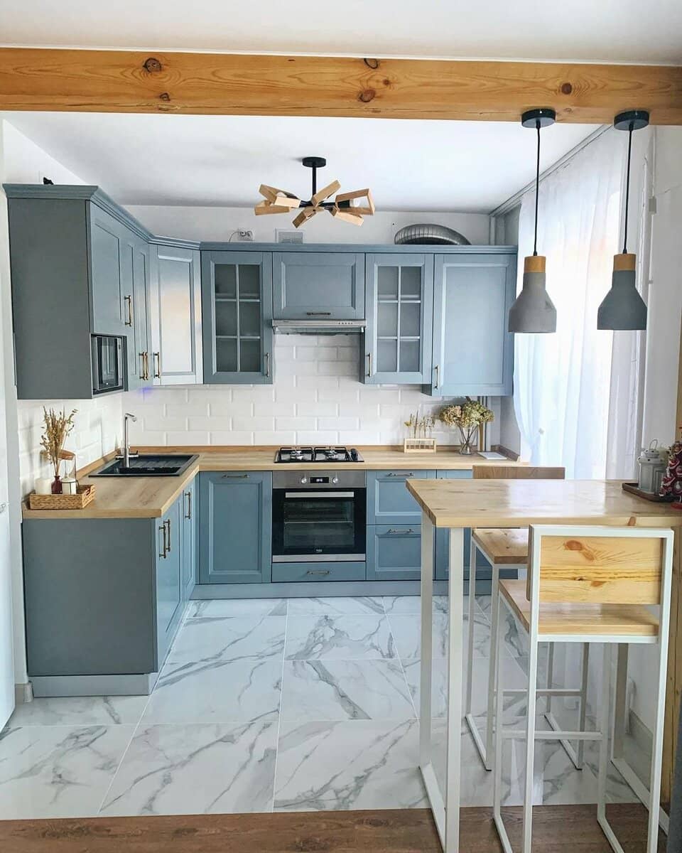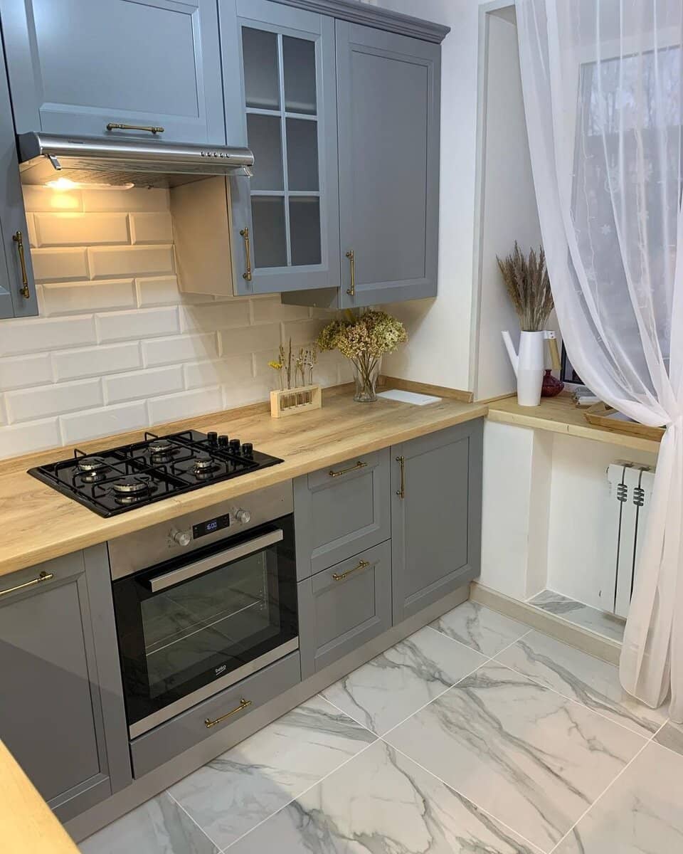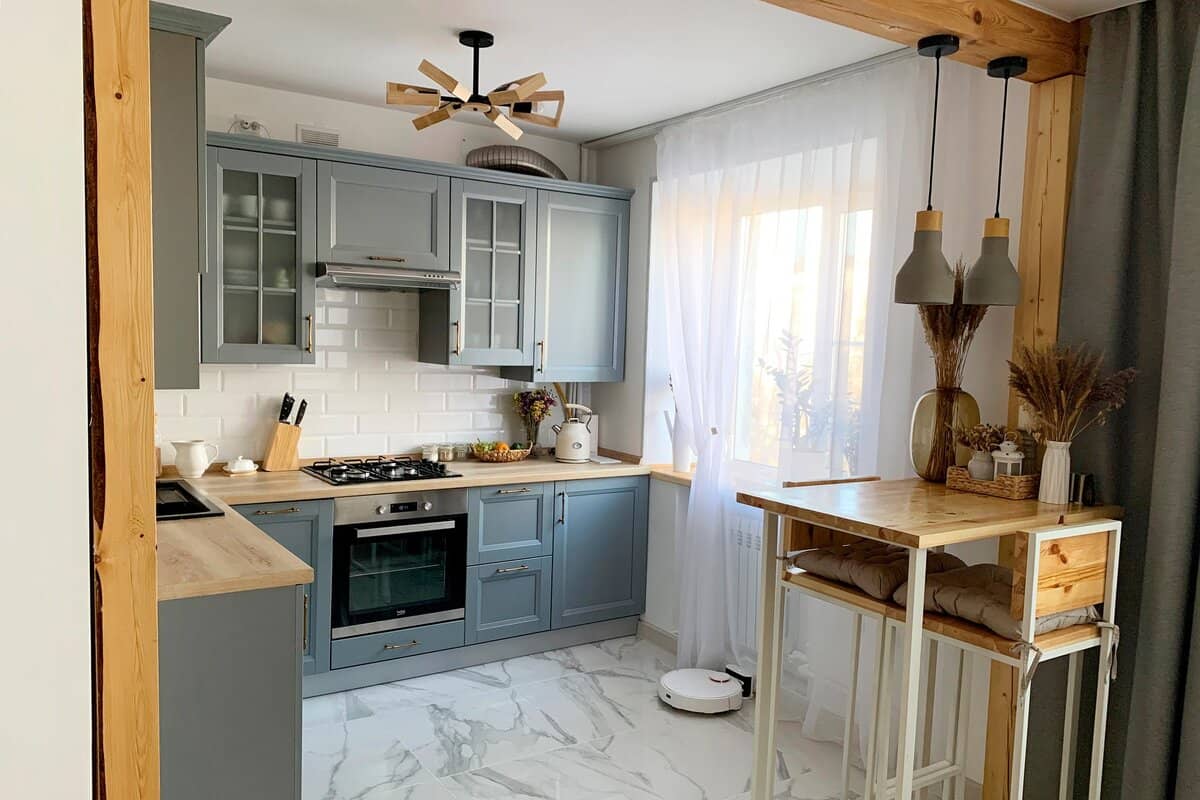 Так сейчас выглядит кухня. Мне нравится результат, особенно серо-голубой цвет кухонных шкафов.
