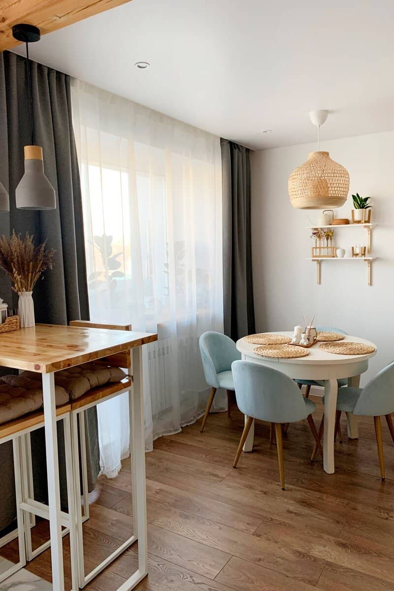 Маме с дочкой хватает такого небольшого столика. Стулья высокие, но девочке вполне комфортно на них сидеть. На случай, если придут гости, в гостиной есть обычный обеденный стол на несколько человек.
