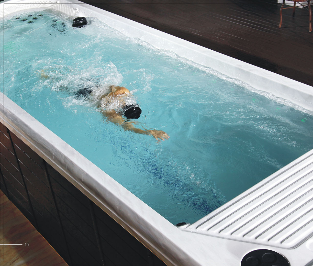 Одним из ключевых преимуществ плавательного бассейна с противотоком является **эффективность тренировок**. Пользователь может заниматься плаванием, не меняя положения тела и не совершая перемещения — это позволяет существенно увеличить тренировочное время и глубину проработки мышц. Система помогает улучшить кардиореспираторную выносливость, поддерживать тонус мышц и снижать нагрузку на суставы.