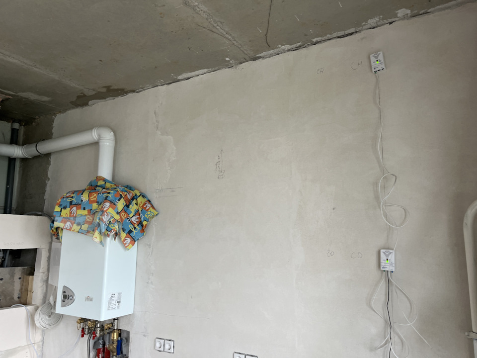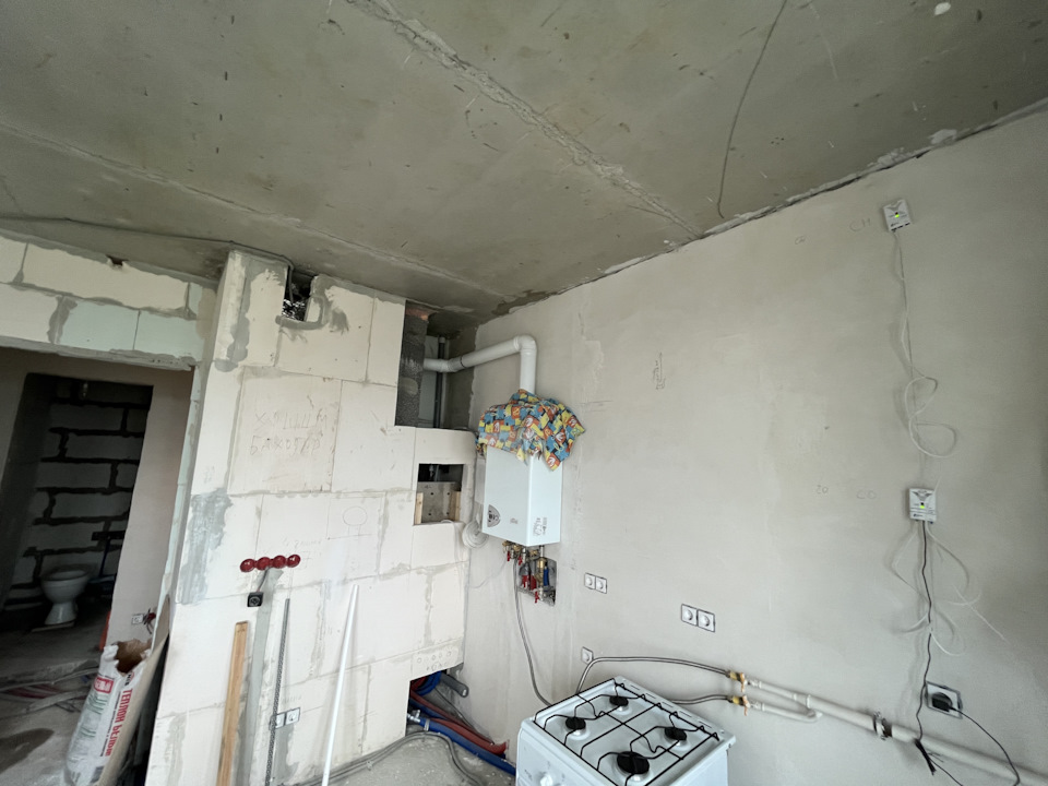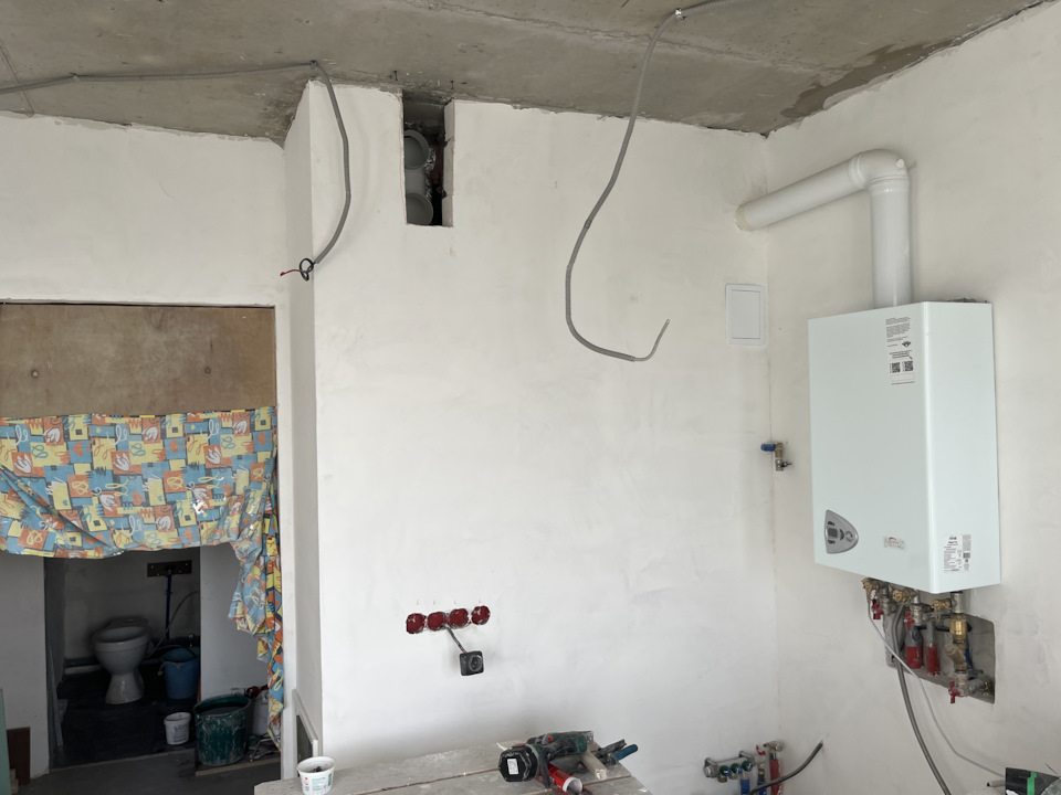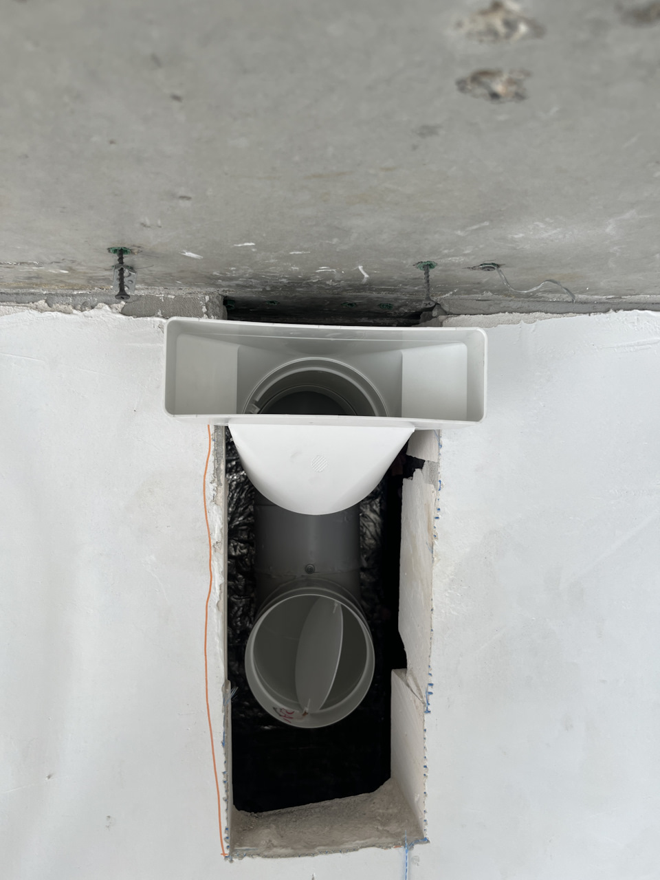 На момент сдачи дома, была только одна вент шахта, уходящая на крышу. Подрезав на высоту чуть выступающую за потолок — я укоротил вент канал, чтобы моя раздвоенная вентиляция была не сильно низко расположена, относительно уровня моего чистого натяжного потолка.