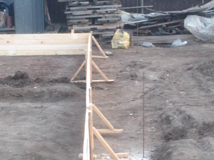 После, начал устанавливать опалубку. Высота опалубки 400 мм, доска 25х100. В качестве упоров использовались брусочки, реечки, собранные на чёрные саморезы.