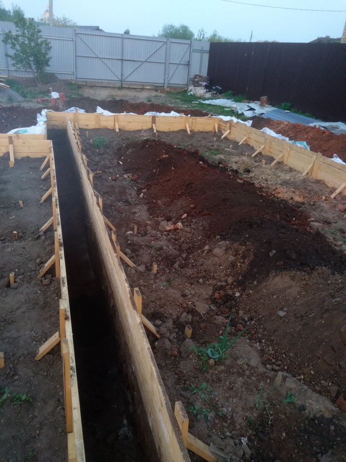 Согласно нагрузкам, которые я подсчитал, указанной ширины было достаточно, но после копа всё же решил внизу траншеи сделать уширения с помощью штык лопаты. На доме это где-то 500-550, на гараже не делал. Там нагрузка минимальная.